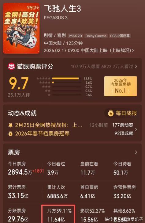 好家伙,《飞驰人生 3》这一脚油门直接踩到了 33 亿票房!在这竞争激烈的档期里,韩寒搭档沈腾,硬是杀出了一条血路,成了当之无愧的赢家。片方收益早就破了 11 亿,要是真如预测冲到 43.4 亿,那分账可得近 17 亿,难怪韩寒在路演时都忍不住暗示:第四部安排上!